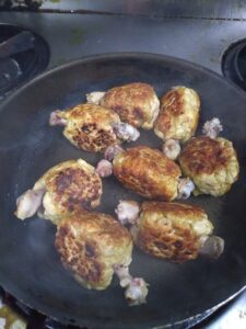 肉を包丁でたたいてミンチにし、スパイス等を混ぜて骨に付けて成形し、加熱して表面に焼き色をつけ、21年継ぎ足してきた「gopのタレ」で煮込んだものを油で揚げるという超面倒な事をや